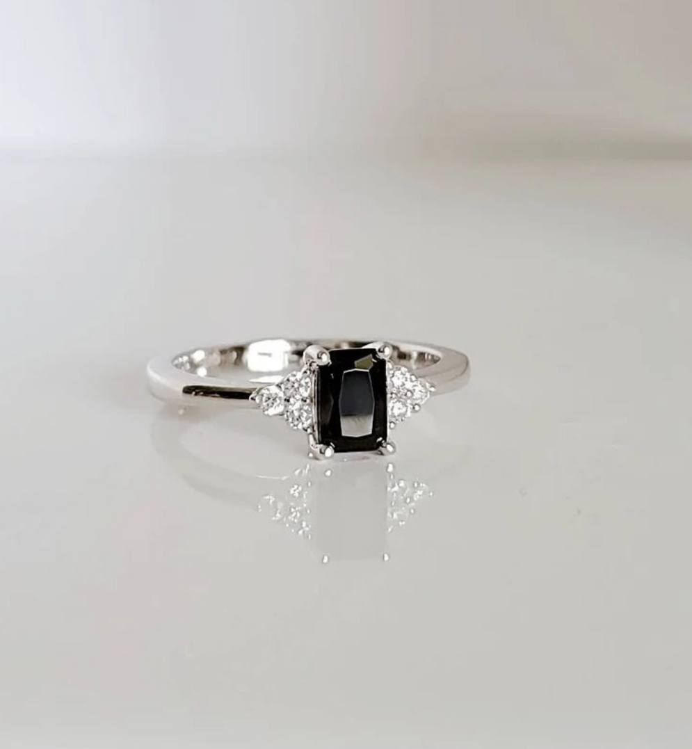 Black Onyx Emerald Cut Sterling Silver Women's Promise Ring