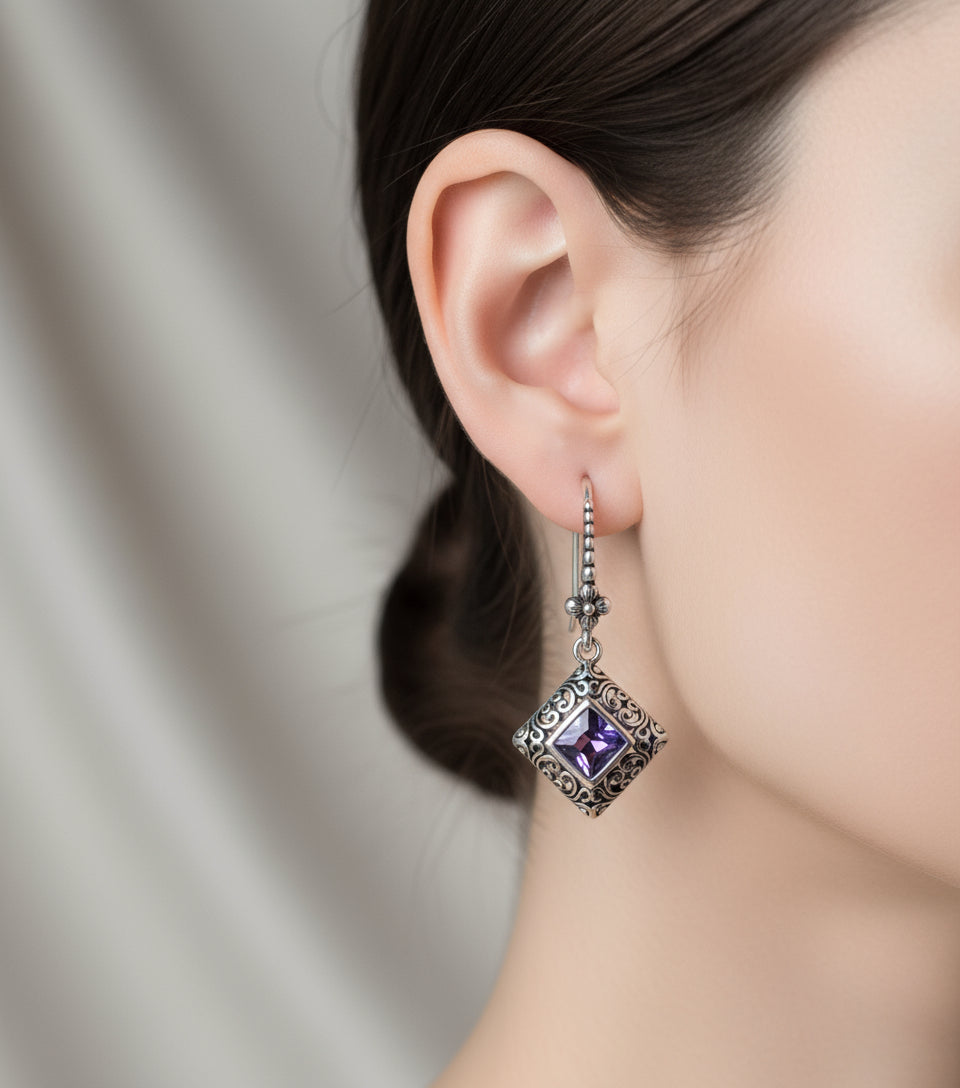 Square Princess Cut Amethyst, Sterling Silver Earrings, Dangle earrings~