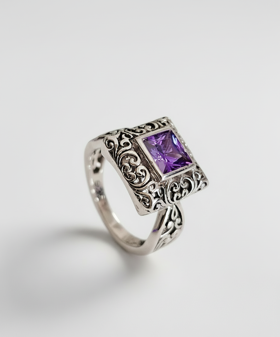 Sterling Silver Bali Square Princess Cut Amethyst Ring