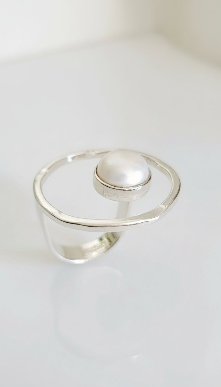 This Floating Pearl Statement Ring is an exclusive piece that offers timeless elegance with a contemporary twist. The combination of the shimmering pearl and hammered silver band creates a stunning contrast, making it a perfect choice for those who love to stand out with refined style.