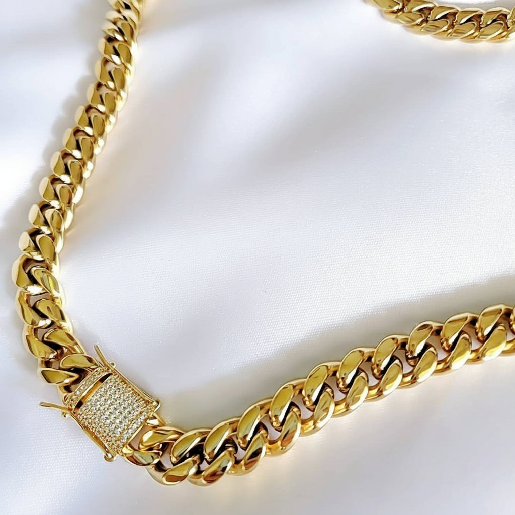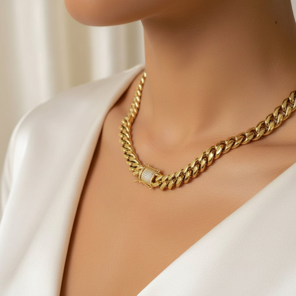Dripping in gold decadence, the Cuban Link chain is back. Its beautiful gold sheen evokes a feminine and delicate vibe, making it the perfect accessory for date nights and other special occasions.