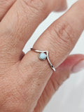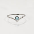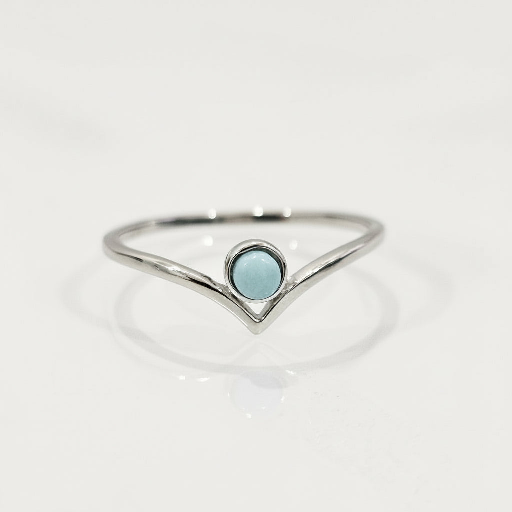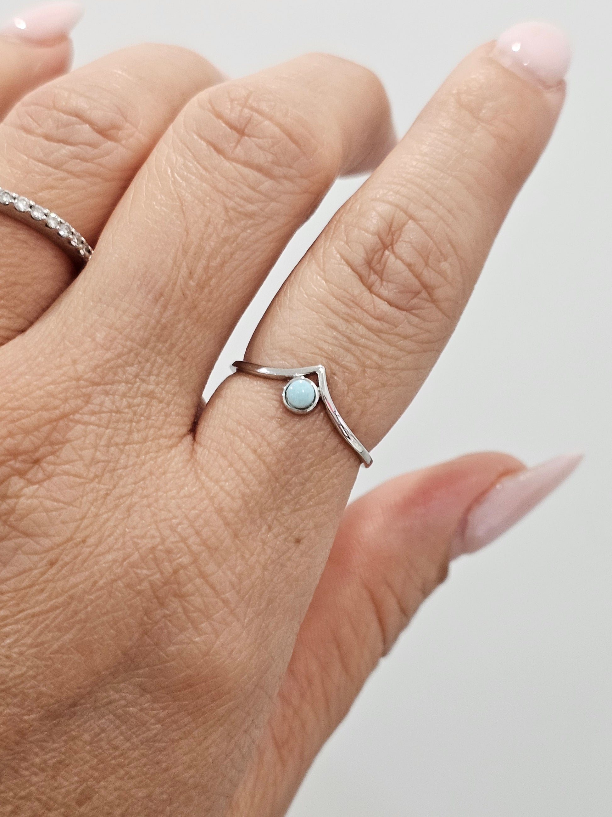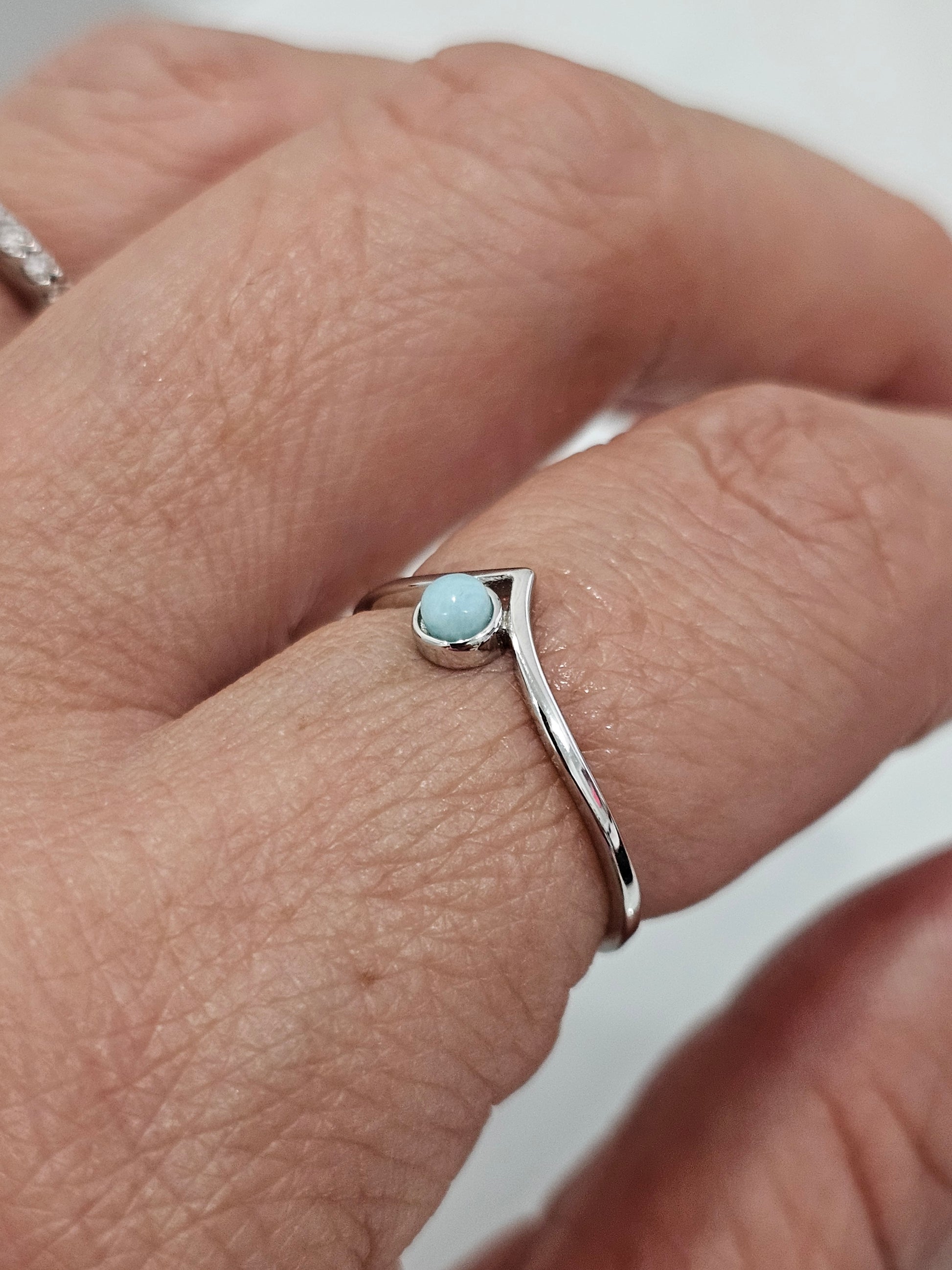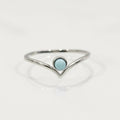 Embrace the tranquil beauty of the Larimar Chevron Ring, a delicate piece that combines the calming energy of Larimar with the timeless appeal of minimalist design. Set in a 925 sterling silver band, this dainty ring features a tear drop-shaped natural Larimar stone, known for its unique blue hue. Its subtle yet striking mandala-inspired design makes it a perfect addition to any jewelry collection, ideal for stacking or wearing alone for a simple statement.