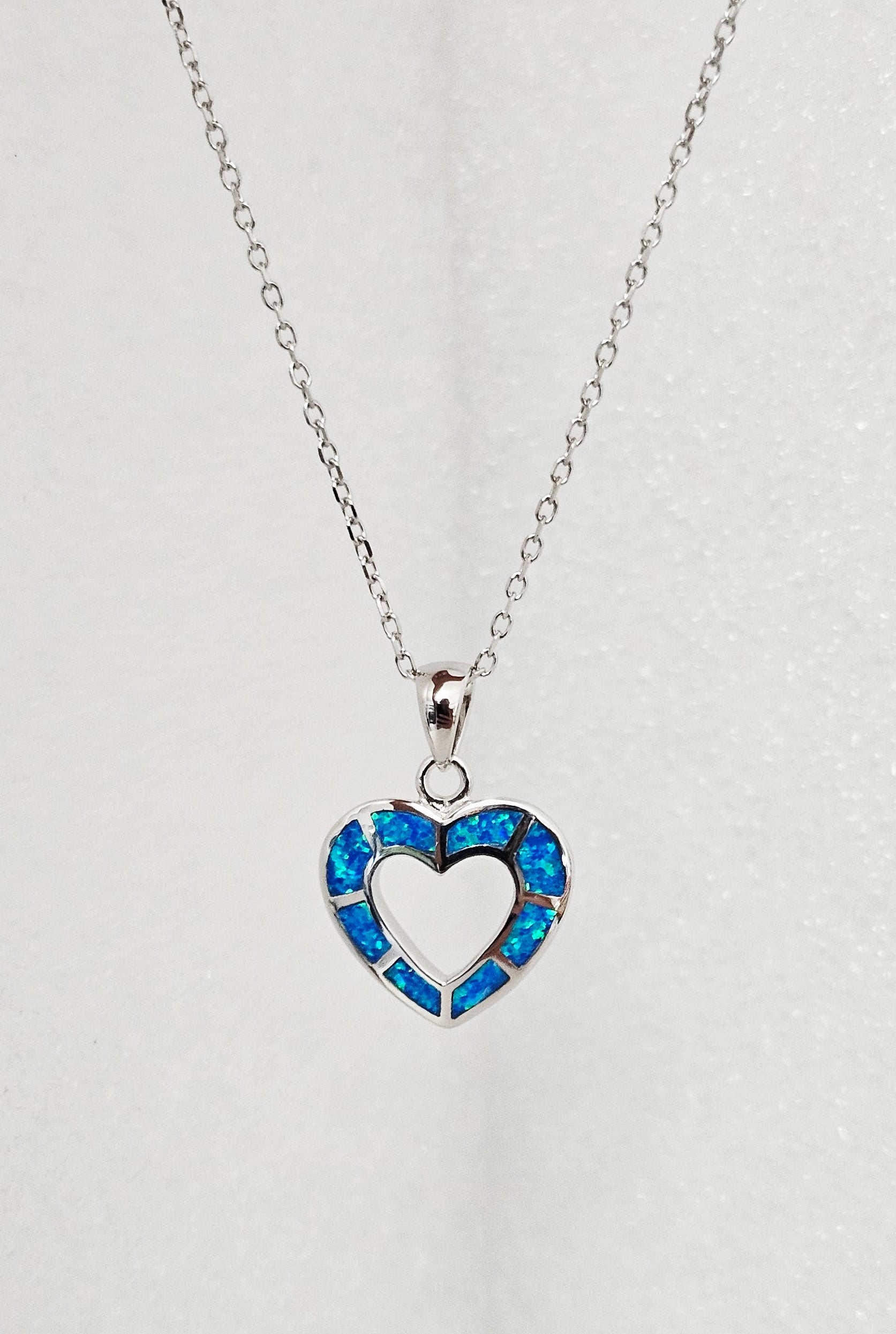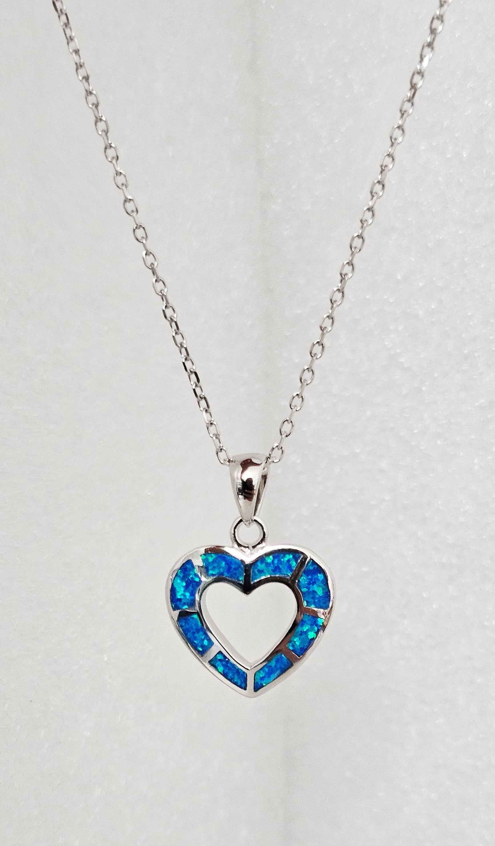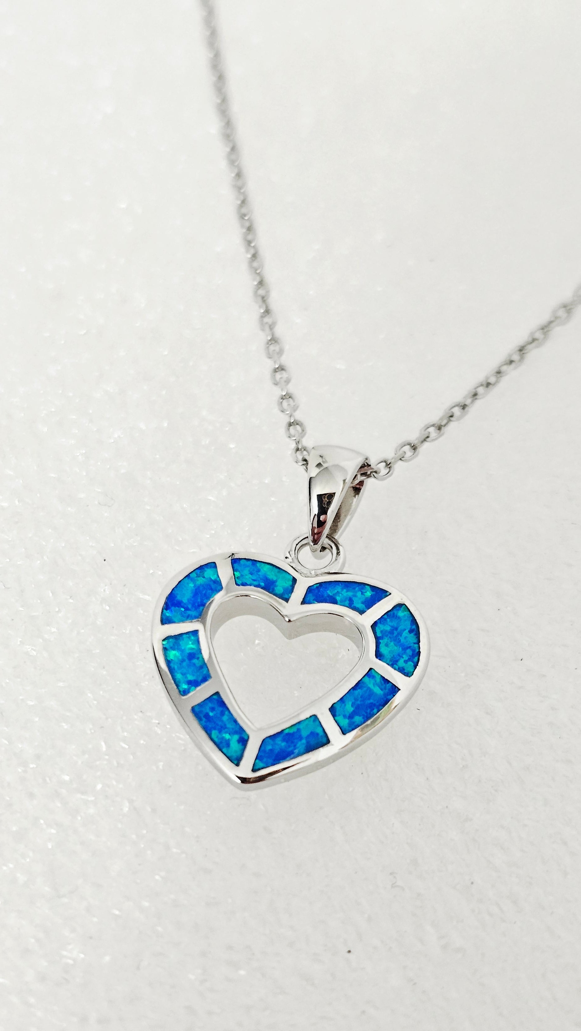 A stunning sterling silver heart pendant featuring blue opal, complete with an included chain.  This exquisite piece of jewelry captures the essence of elegance and grace. The heart-shaped blue opal shimmers with an array of captivating colors, reflecting light with every movement. The sterling silver setting enhances the opal's vibrant hues, creating a harmonious blend of sophistication and charm. Perfect for any occasion, this pendant makes an ideal gift for a loved one or a beautiful addition to your own collection. The included chain ensures that it can be worn immediately, adding a touch of timeless beauty to any outfit.