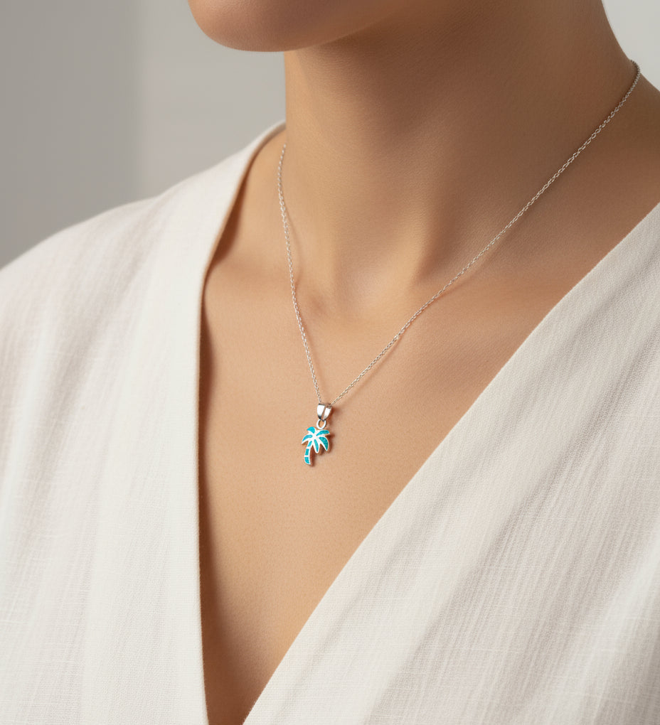 The pendant features a meticulously crafted palm tree design, with each frond delicately detailed to evoke the serene beauty of a coastal paradise. Nestled within the palm's embrace is a stunning blue opal, its iridescent hues reminiscent of the shimmering ocean waves. This necklace is not just an accessory, but a statement piece that brings a touch of the beach to any outfit, making it perfect for both casual outings and special occasions.