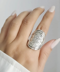 Embrace the essence of Bohemian elegance with this Shield Sterling Silver Ring. Handcrafted with intricate Bali-inspired designs, this statement ring exudes charm, individuality, and a touch of exotic allure. Perfect for the free-spirited woman, this adjustable ring is designed to complement your unique style.