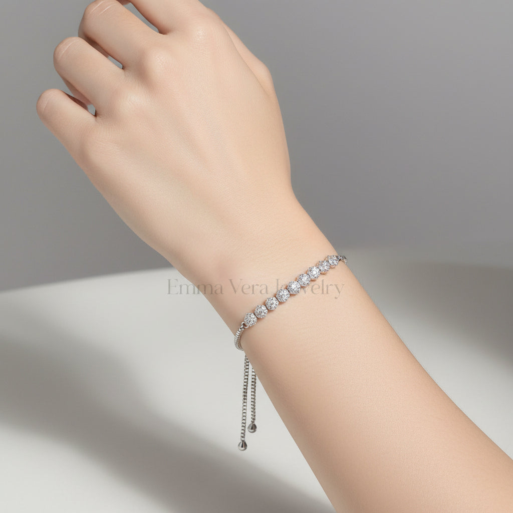Enhance your elegance with this Dainty Slider Bracelet, a contemporary tennis bracelet that sparkles with top-quality simulated diamonds. Designed for the modern woman who seeks a refined yet shimmering accessory, this adjustable bracelet is the perfect addition to any outfit. Whether for bridesmaids, anniversaries, or everyday wear, this timeless piece offers a touch of sophistication that can be worn with confidence at any event.