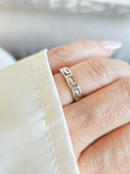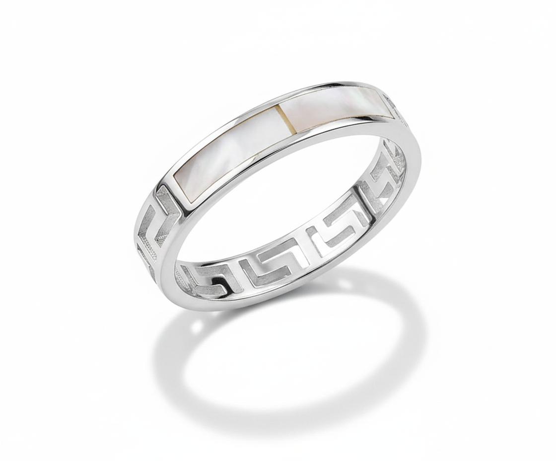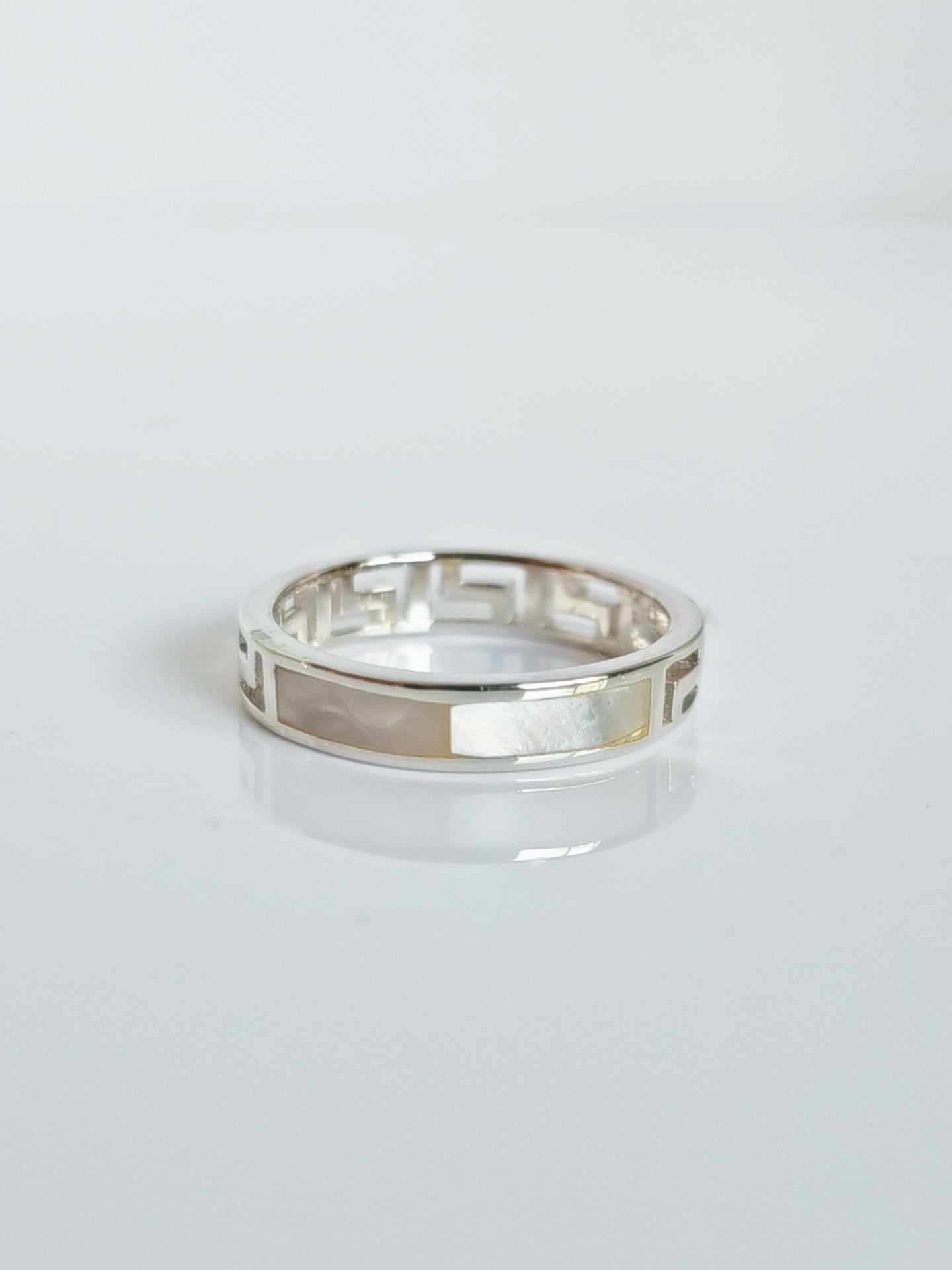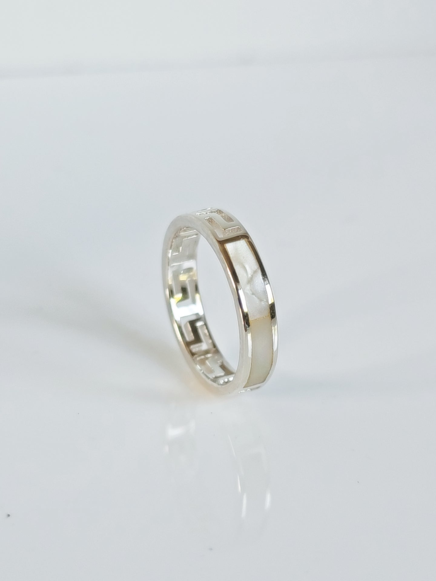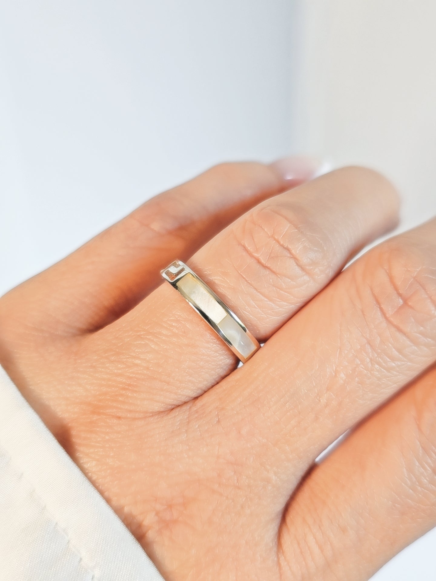 This elegant mother of pearl band exudes timeless beauty and sophistication. Crafted from high-quality 925 sterling silver, this ring features an inlaid mother of pearl that wraps around the entire band, offering a stunning iridescent shimmer. The natural beauty of the mother of pearl reflects light like the serene beauty of ocean waves, making this ring a true work of art. Perfect as an engagement band, anniversary ring, or a special gift, this piece is a versatile addition to any jewelry collection.