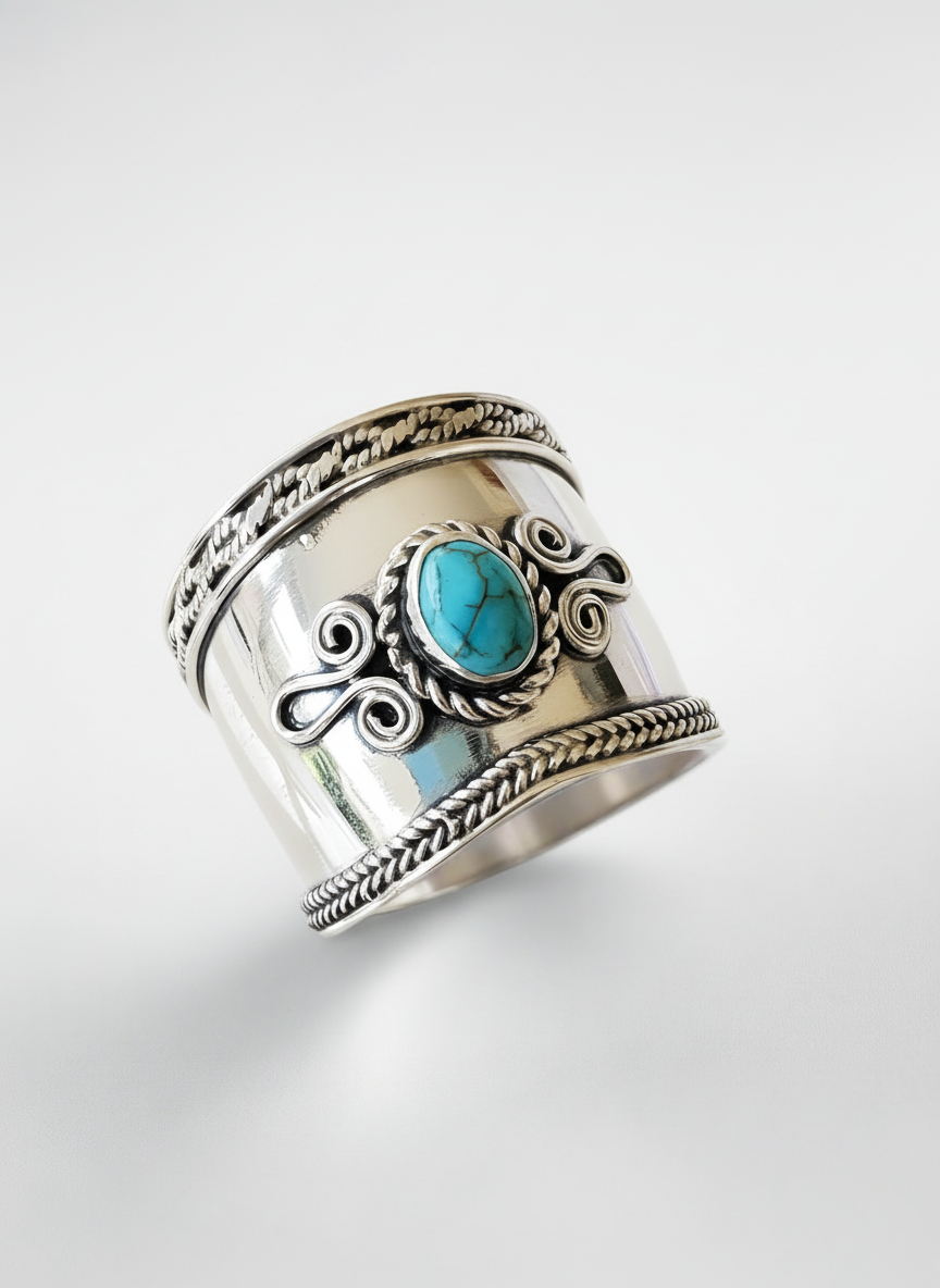 Bali Turquoise Concave Band Ring – Sterling Silver Boho-Chic Jewelry